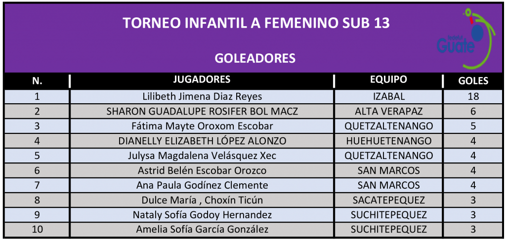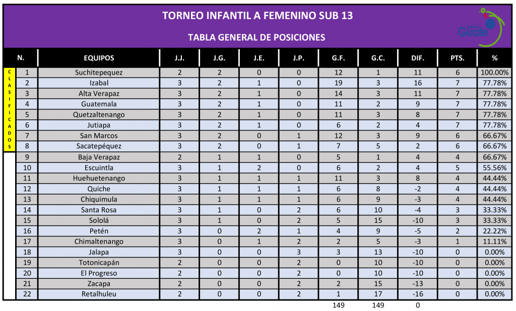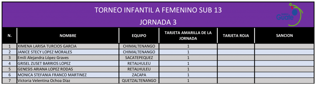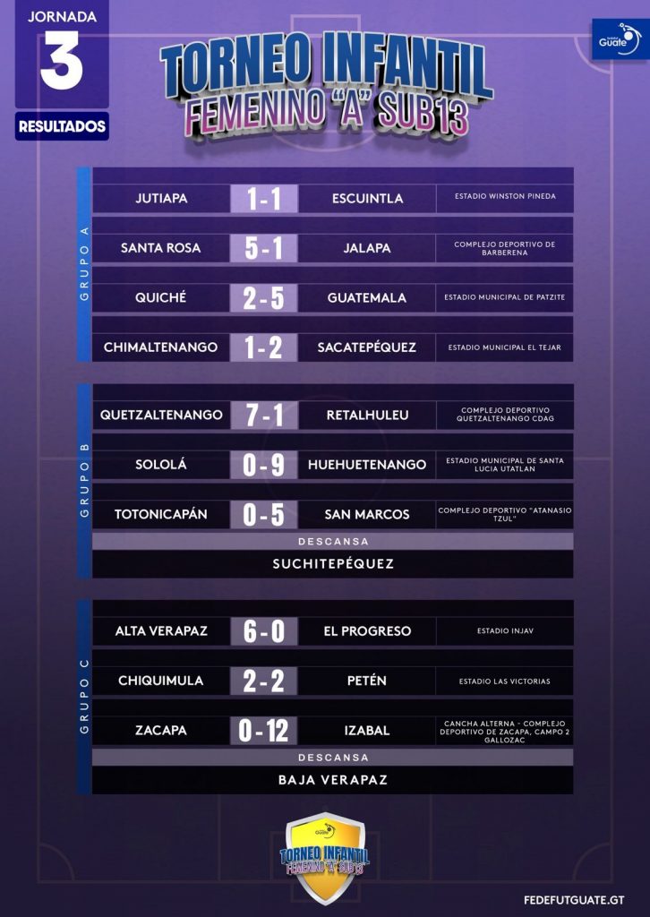 La Dirección de Desarrollo Técnico de la Fedefut, presenta los resultados y estadísticas correspondientes a la TERCERA JORNADA del TORNEO INFANTIL FEMENINO “A” SUB 13, que organiza la Federación a nivel nacional y donde participan las selecciones femeninas, categoría 2011 – 2012 de las 22 Asociaciones Departamentales de Fútbol de todo el país.