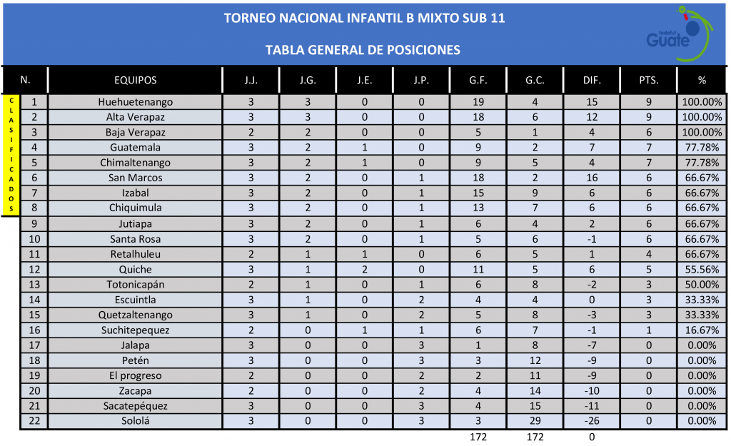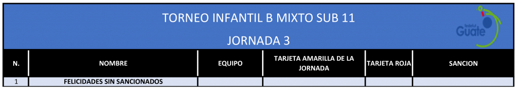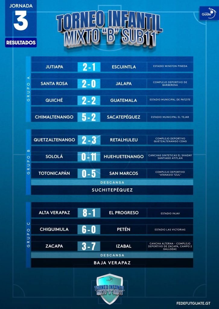 La Dirección de Desarrollo Técnico de la Fedefut, presenta los resultados y estadísticas correspondientes a la TERCERA JORNADA del TORNEO INFANTIL MIXTO “B” SUB 11, que organiza la Federación a nivel nacional y donde participan las selecciones de niños y niñas, categoría 2013 -2014 de las 22 Asociaciones Departamentales de Fútbol de todo el país.