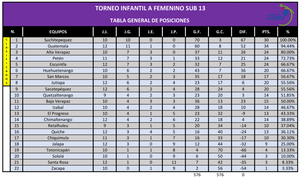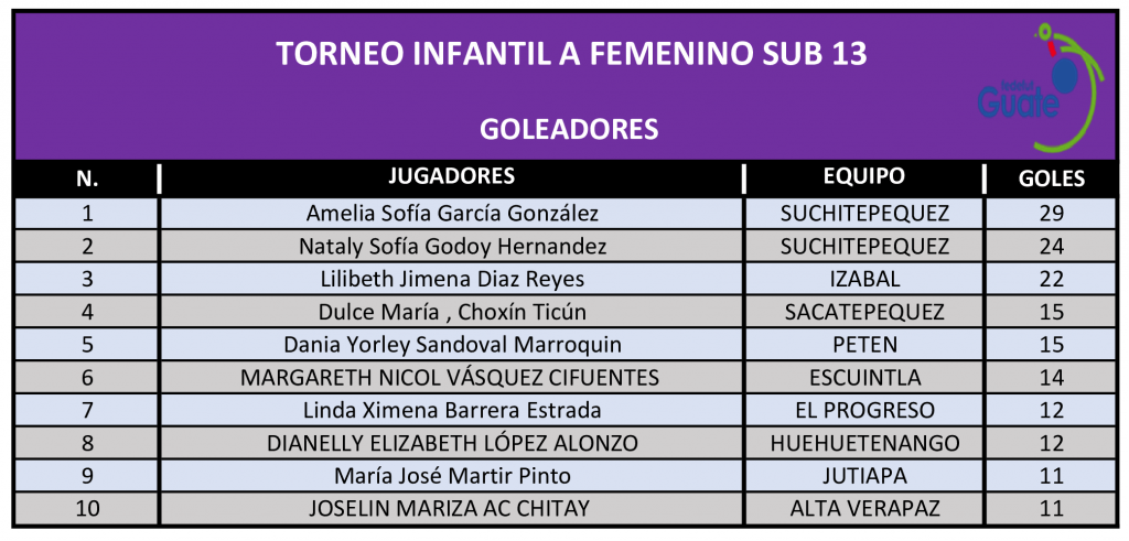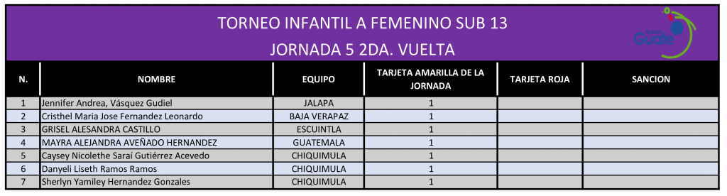 La Dirección de Desarrollo Técnico de la Fedefut, presenta los resultados y estadísticas correspondientes a la Quinta Jornada de la Segunda Vuelta del TORNEO INFANTIL FEMENINO “A” SUB 13, que organiza la Federación a nivel nacional y donde participan las selecciones femeninas, categoría 2011 – 2012 de las 22 Asociaciones Departamentales de Fútbol de todo el país.