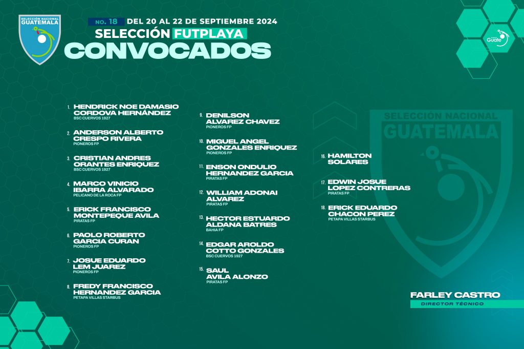 El Director Técnico de Selección Fútbol playa de Guatemala, Prof. Farley Castro, ha dado a conocer la nómina de Selección de Futplaya convocada para el microciclo de trabajo No. 18, programado para las fechas del 20 al 22 de septiembre del 2024.