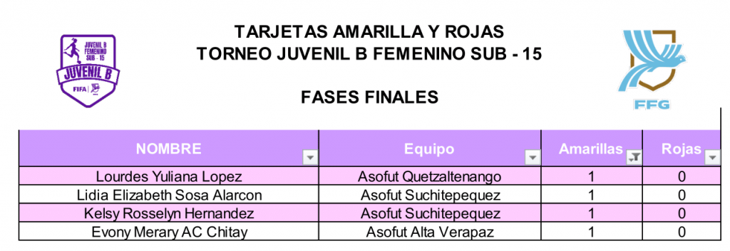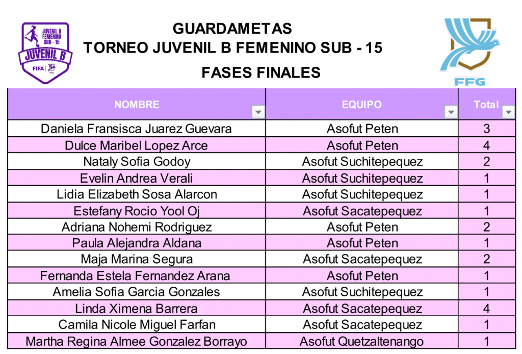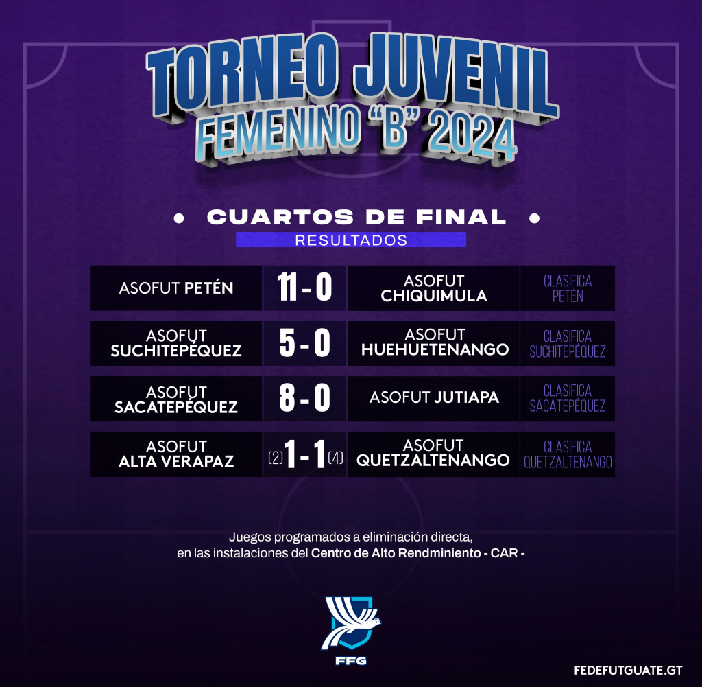 La Dirección de Desarrollo Técnico de la FFG, presenta las estadísticas, de los cuartos de final del Torneo Nacional Femenino Categoría Juvenil B que organiza la Federación, con la participación de niñas de 14 y 15 años integrantes de las Selecciones Femeninas de 8 Asociaciones Departamentales de Fútbol de Guatemala.
