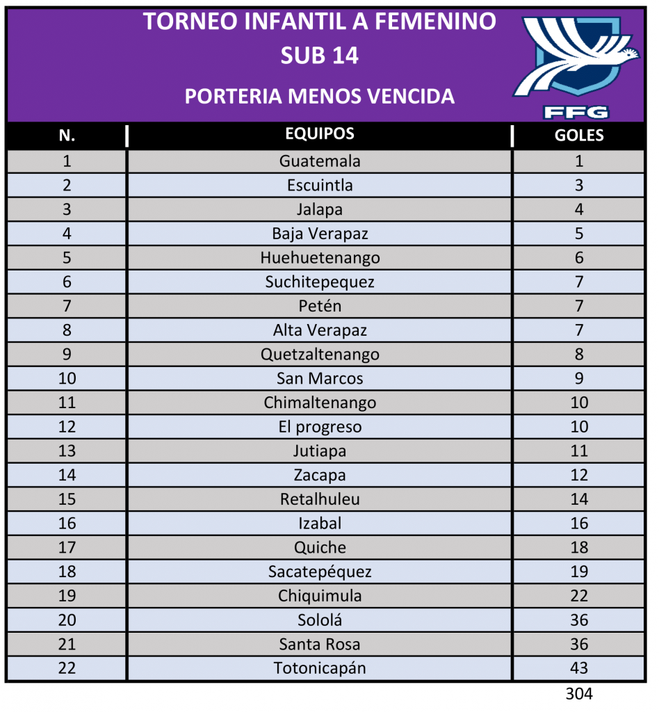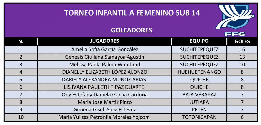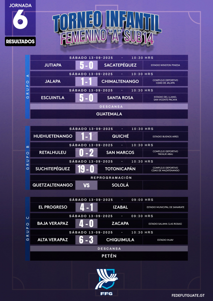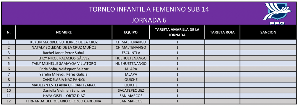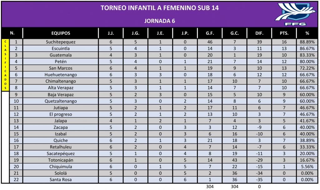 La Dirección de Desarrollo Técnico de la FFG, presenta las estadísticas, de la sexta jornada del Torneo Infantil Femenino ¨A¨ Sub 14 que organiza la Federación, en todo el país.